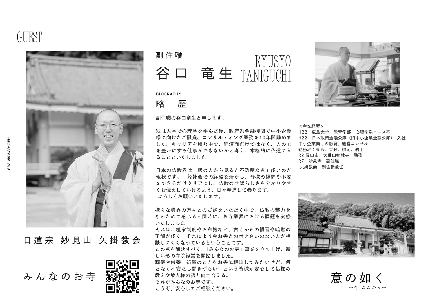 | 14:45 | オープニング | 谷口副住職の紹介「異色の経歴を持つ副住職と探る、日常の智慧」心理学専攻、金融機関10年勤務というキャリアから「なぜ今、仏道なのか」 |